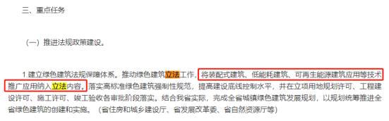 在重點任務中,提出推進法規政策建設:推動綠色建筑立法工作,將裝配式建筑、可再生能源應用等技術推廣應用納入立法內容。