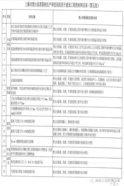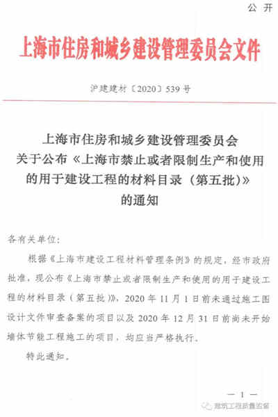 2020年9月30日,上海市住房和城市建設管理委員會關于公布《上海市禁止或者限制生產和使用的用于建設工程的材料目錄《(第五批)》的通知