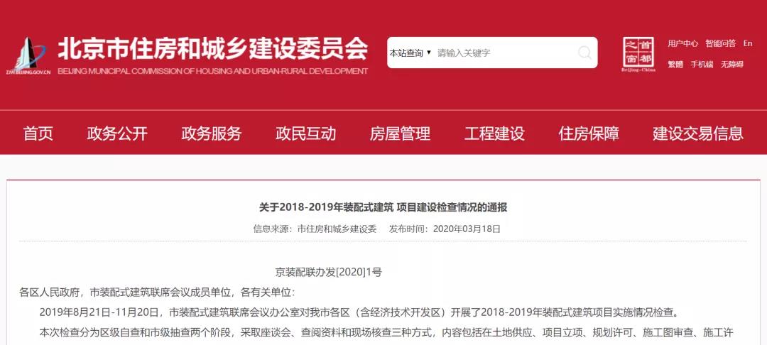 2020年3月18日,北京市發(fā)展裝配式建筑工作聯(lián)席會議辦公室《關(guān)于2018-2019年裝配式建筑項目建設(shè)檢查情況的通報》,內(nèi)容強調(diào):